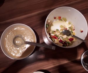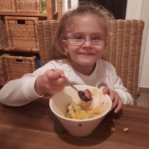 Es wurden Lieblingsobstsorten gesammelt, Einkaufszettel gemalt und geschrieben (differenziert nach Klasse 0 und Klasse 3), eingekauft und ein leckerer Obstsalat mit Vanillepudding (ohne Zucker!) zubereitet.